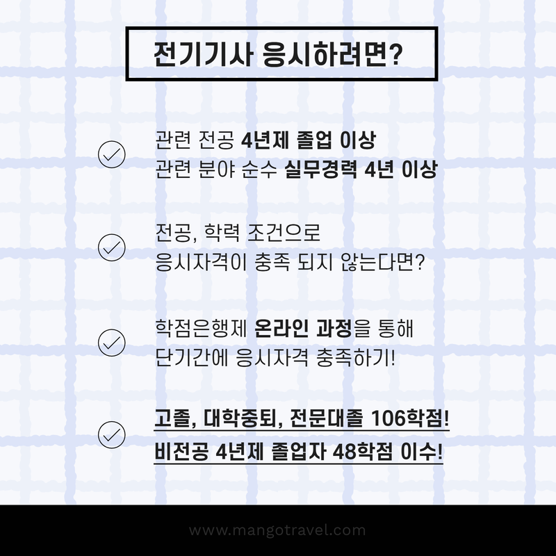 전기기사 응시를 위해서는 관련 전공으로 4년제 졸업 (예정) 조건이 필요한데, 학점은행제에서는 보통 106학점 이상 취득 시 관련 전공 4년제 졸업 예정자와 동등한 자격이 부여됩니다. 이 모든 과정을 온라인으로 진행할 수 있어 직장인도 부담 없이 참여 가능합니다.