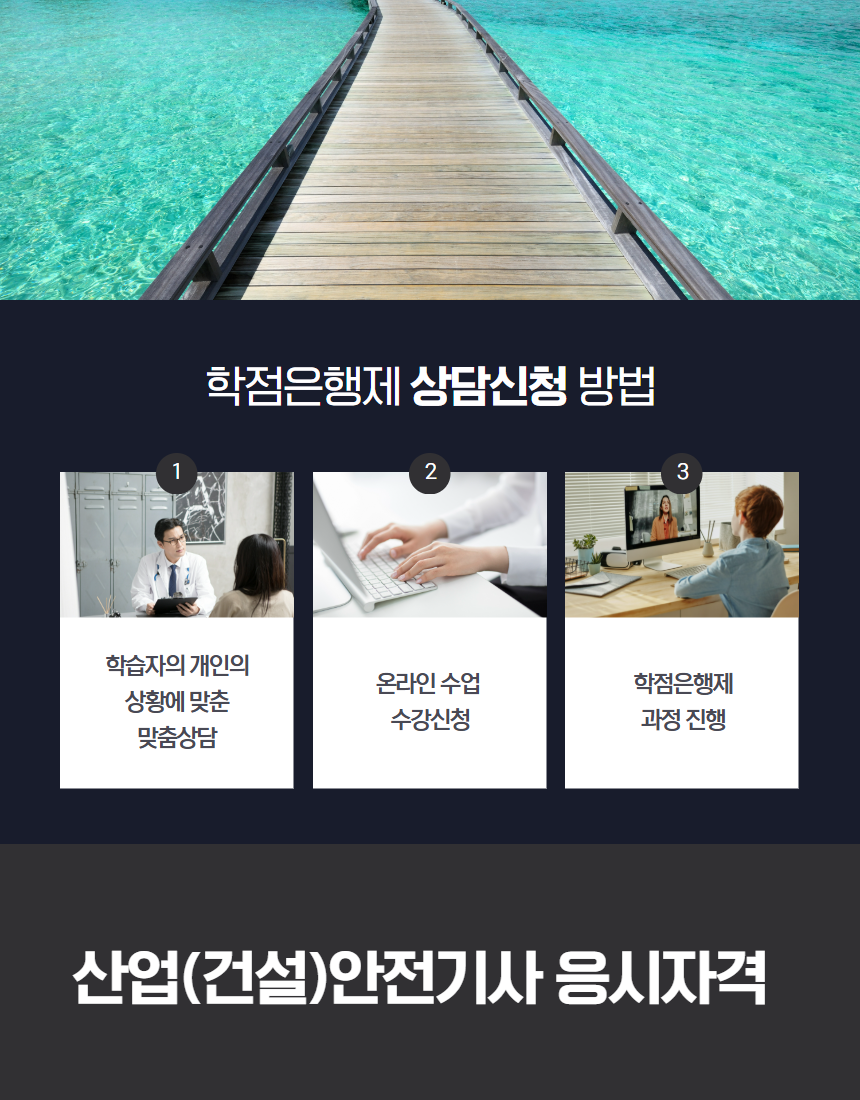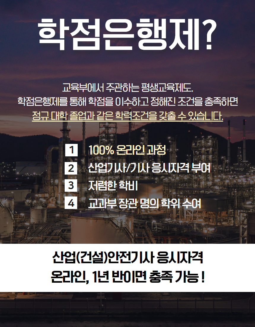 학점은행제를 통해 관련 전공 106학점을 취득하면, 산업(건설)안전기사 시험에 응시할 수 있는 길이 열립니다.