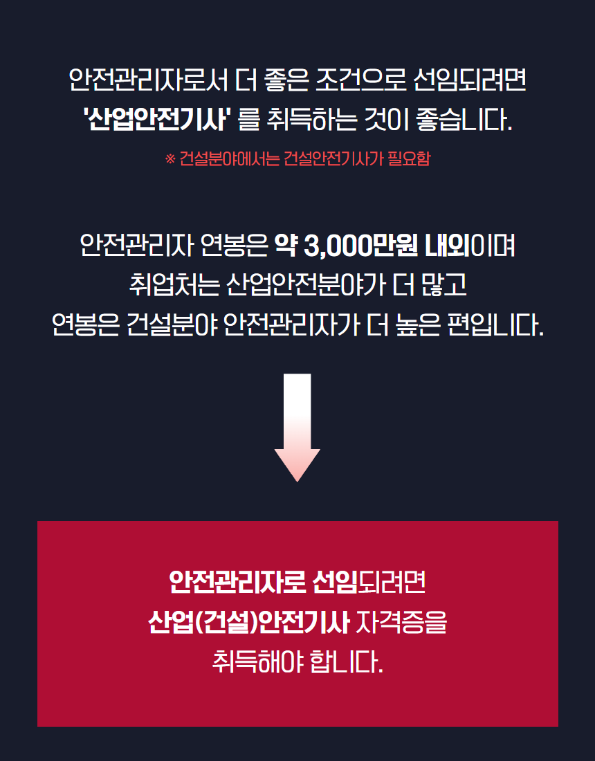 특히 건설 현장에서는 건설안전기사가 필요합니다. 일반 산업 분야보다 건설 분야 안전관리자의 연봉이 더 높은 편이며, 수요 역시 꾸준합니다.