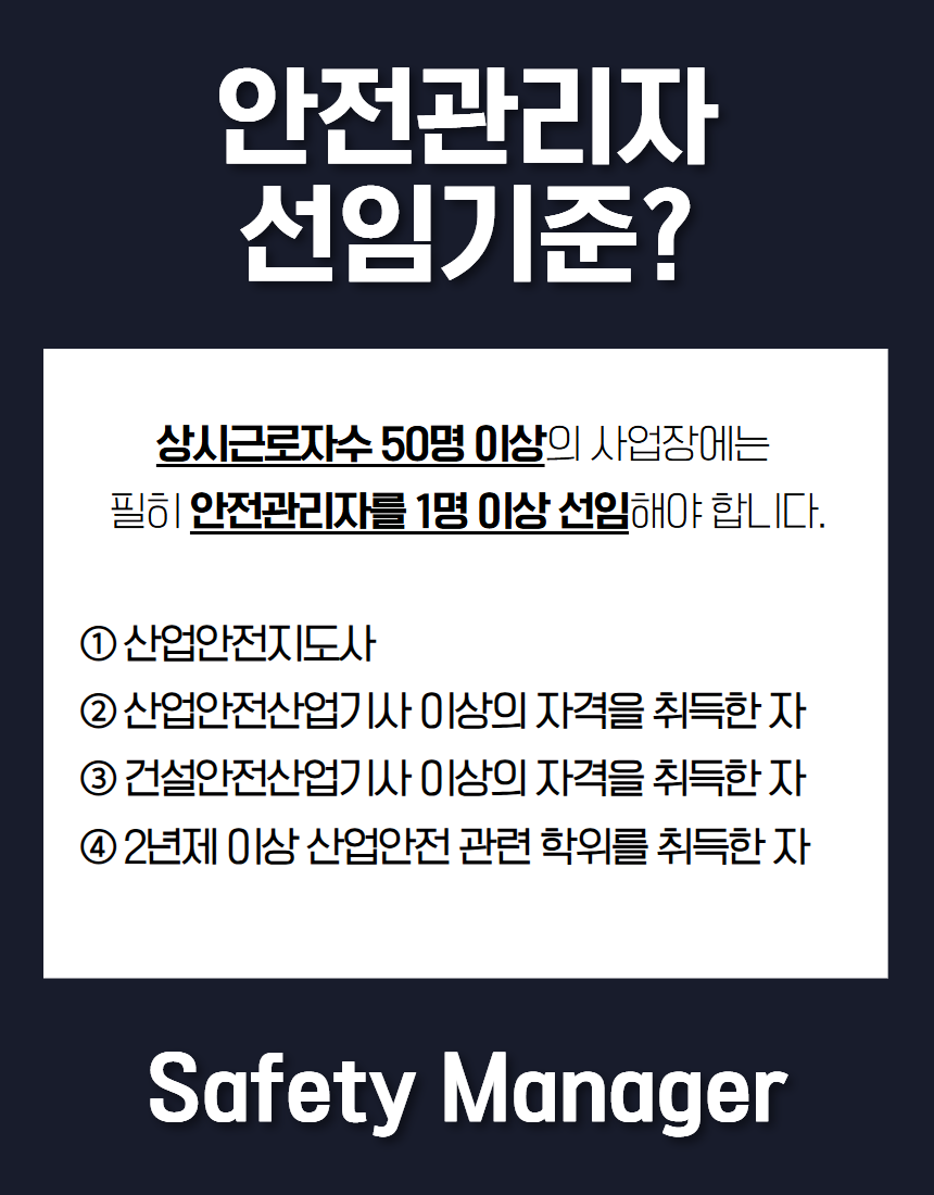 안전관리자 선임기준은 「산업안전보건법」에 명시되어 있습니다. 대표적인 선임 자격은 다음과 같습니다: