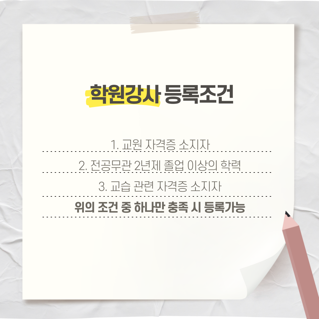 많은 분들이 학원강사가 되기 위해서는 반드시 교사 자격증이 있어야 한다고 생각하는데, 사실 조건은 더 유연합니다. 교육청이 정한 공식 교육청 학원강사 등록조건은 다음 세 가지 중 ‘하나’만 충족하면 됩니다.