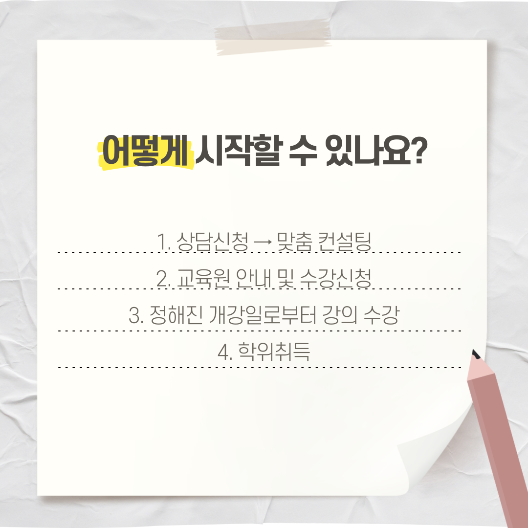 이러한 과정을 통해 전문학사 학위를 취득하면, 명확하게 교육청 학원강사 등록조건 중 ‘학력’ 요건을 충족시키는 겁니다.