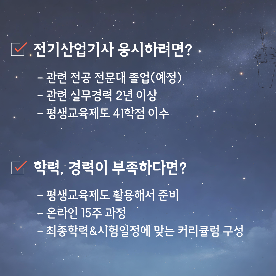 예를 들어 전기 관련 기초 자격증을 먼저 취득하거나, 독학사 시험을 준비하면 학점을 빠르게 쌓을 수 있죠.