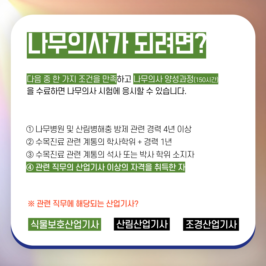 ※ 이 중 한가지를 충족하고 150시간의 양성과정을 거치면 나무의사 응시자격은 충족됩니다. 다른 조건이 어렵기 때문에 대부분 관련 산업기사 자격증 취득으로 조건을 맞추는 분들이 많습니다.