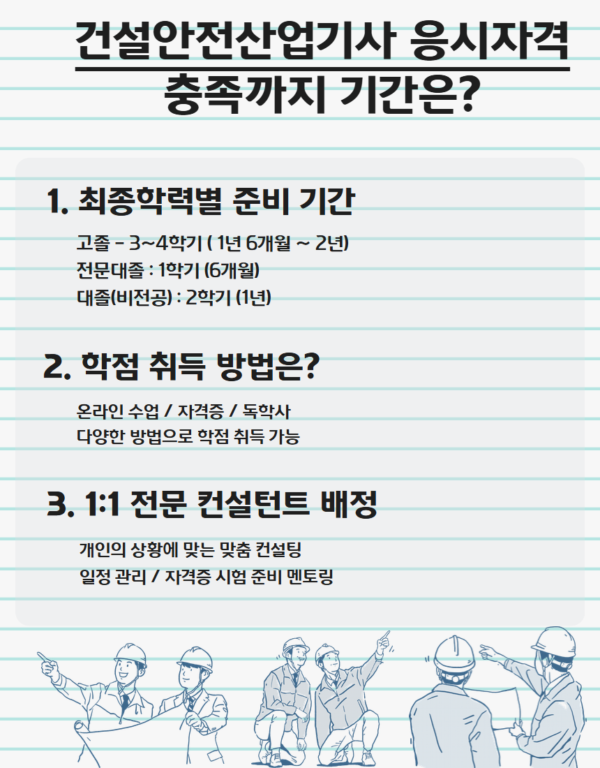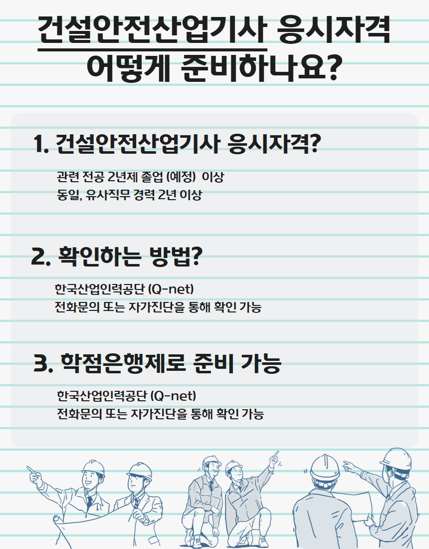 1. 관련 학과(건설, 안전, 환경 등) 2년제 전문대학 졸업(또는 졸업 예정)