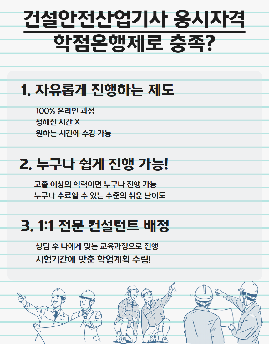 지금까지 건설안전산업기사 응시자격을 학점은행제라는 합법적이고 현실적인 방법으로 해결하는 길을 알아보았습니다. 복잡해 보이는 규정도 올바른 정보와 체계적인 플랜이 있다면 여러분의 도전을 돕는 디딤돌이 될 수 있습니다. 새로운 가능성을 열어갈 준비가 되셨다면, 오늘부터 첫 걸음을 내딛어보는 것은 어떨까요?