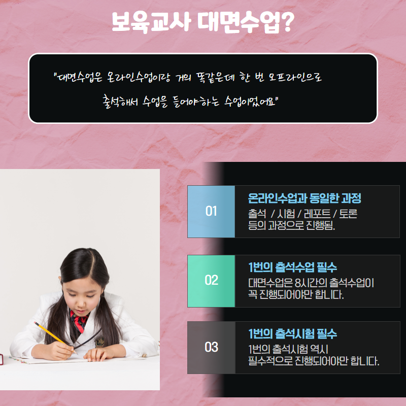 대면 수업은 실제 교육 현장에서 필요한 소통 능력과 실무 감각을 기르는 데 도움이 됩니다.