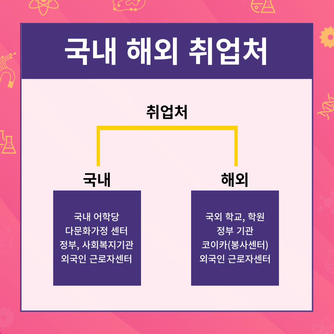 글로벌 수요 증가: 전 세계 많은 국가에서 정규 교육과정에 한국어 과목을 신설하며, 전문 교원을 적극 채용하고 있습니다.