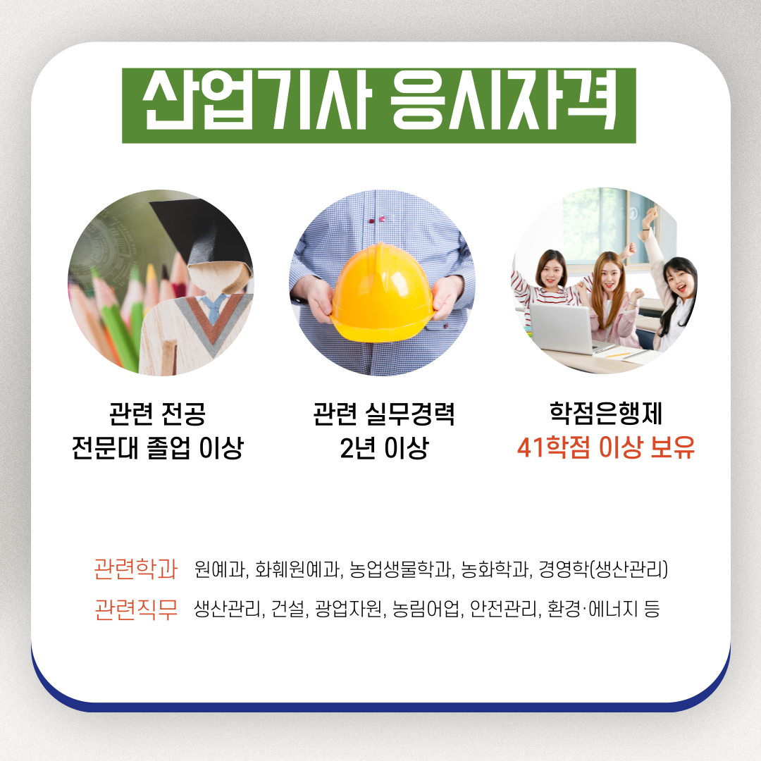 하지만 산업기사 시험 역시 아무나 볼 수 있는 것은 아닙니다. 산업기사 응시를 위해서는 다음 조건이 필요합니다.