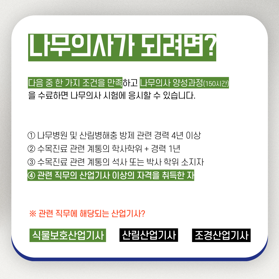 시험에 응시하기 위해서는 기본적으로 '나무의사 양성과정(150시간)'을 수료해야 하며, 이 교육을 듣기 위해서라도 아래 조건 중 하나를 반드시 충족해야 합니다.