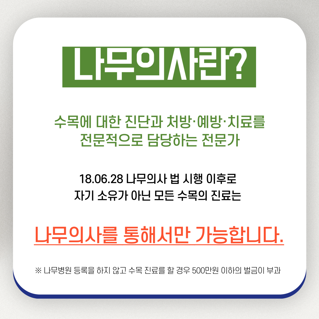 나무의사는 수목에 대한 진단과 처방, 예방, 치료를 전문적으로 담당하는 전문가를 말합니다. 과거에는 수목 소독이나 방제 작업이 전문성 없이 이루어지는 경우가 많았으나, 이제는 수목의 상태를 정확히 진단하고 적절한 약제를 처방하는 과정이 법적으로 의무화되었습니다. 만약 나무병원 등록을 하지 않고 수목 진료를 수행할 경우 500만 원 이하의 벌금이 부과될 정도로 엄격하게 관리되고 있습니다.