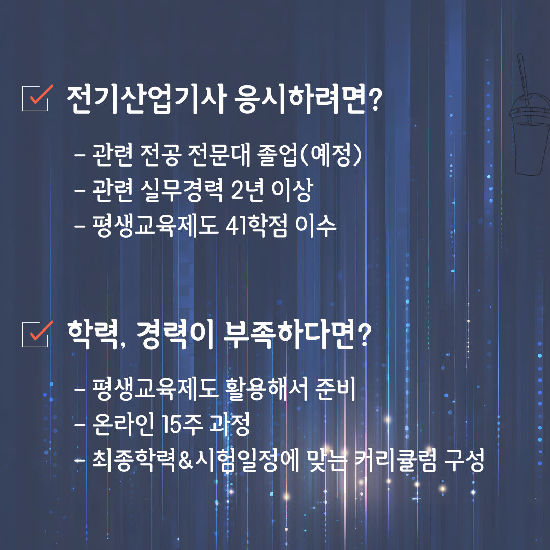 하지만 다음과 같은 방법을 병행하면 단 4개월(1학기) 만에 전기산업기사 응시자격 요건을 갖출 수 있습니다.