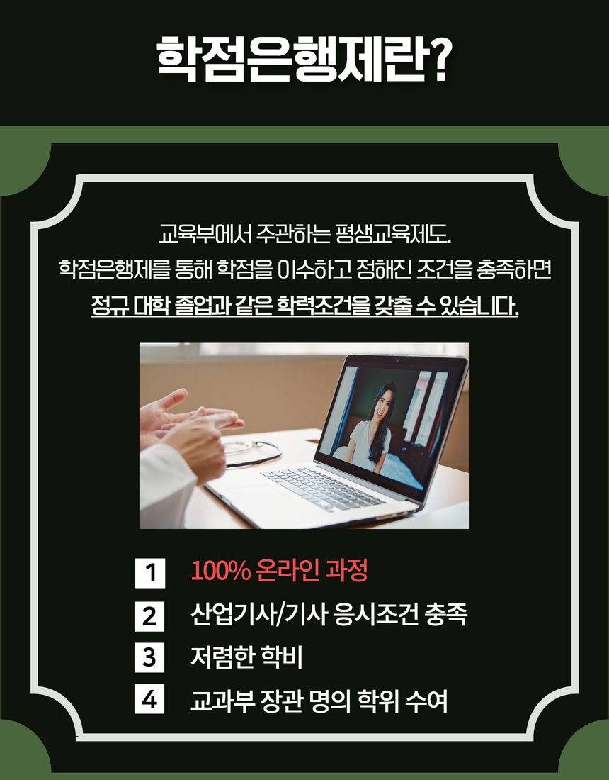 학점은행제는 교육부에서 운영하는 평생교육제도입니다. 이를 통해 온라인 수업, 자격증 취득, 독학사 시험 등을 통한 학점 이수가 가능하며, 일정 조건을 충족하면 정규 대학 졸업과 동등한 학력을 인정받을 수 있습니다. 이 제도는 식물보호기사 응시자격을 갖추기에 가장 효율적인 길입니다.