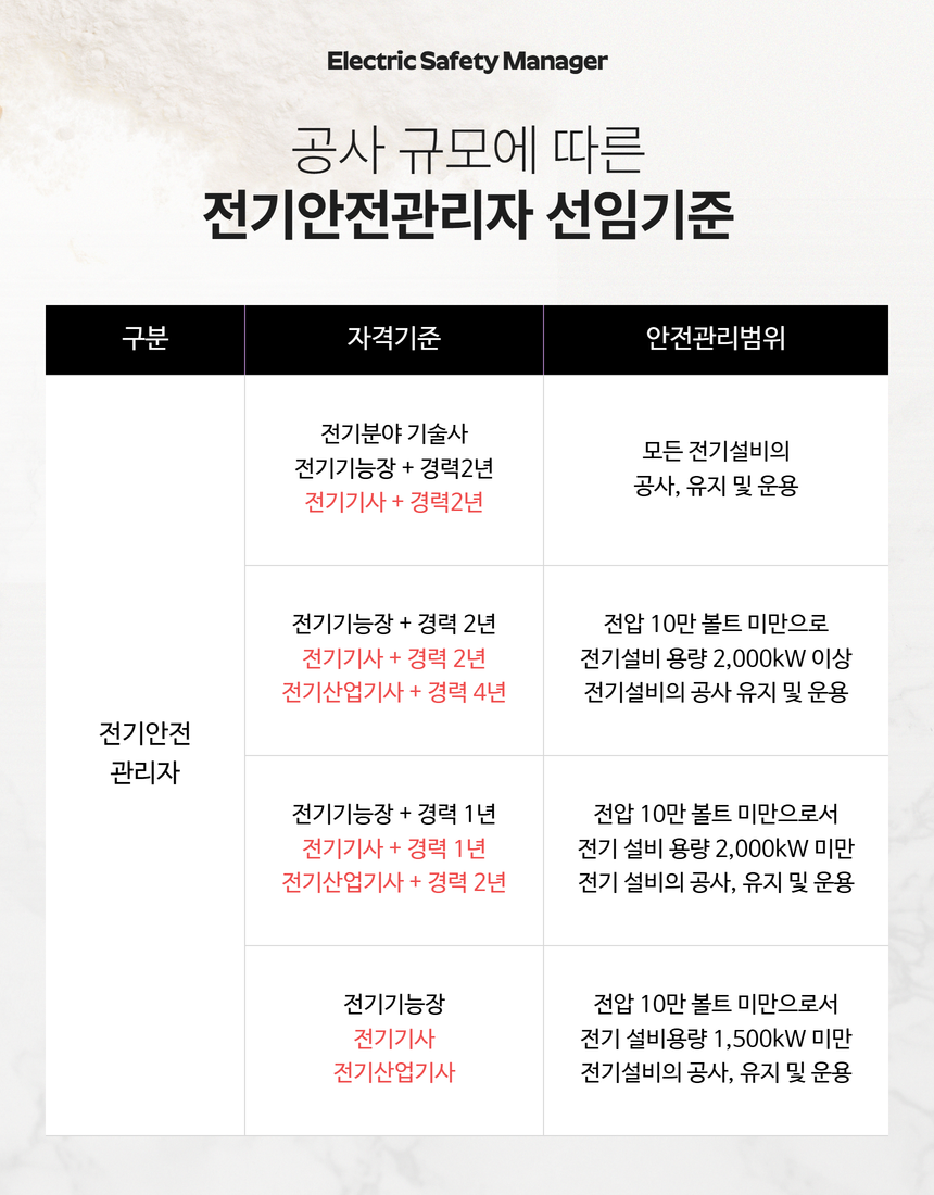 가장 중요한 것은 시설의 규모(전압, 설비용량)에 따라 요구되는 자격과 경력이 달라진다는 점입니다. 아래 표를 통해 전기안전관리자 선임기준을 확인해보세요.