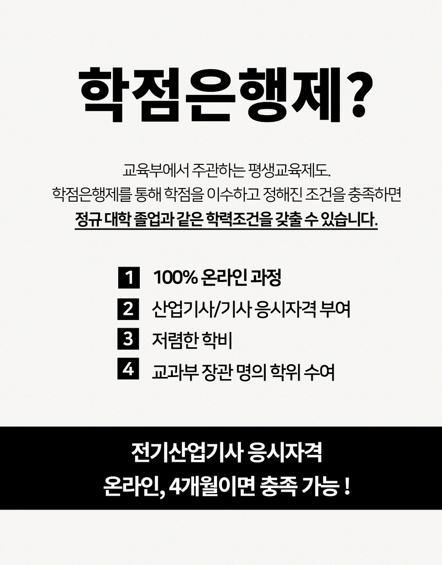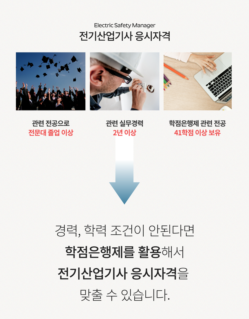 그렇다고 방법이 없는 것은 아닙니다! 국가교육제도인 학점은행제를 활용하면 전기산업기사 응시자격을 갖추고 전기안전관리자 선임기준을 충족할 수 있습니다.