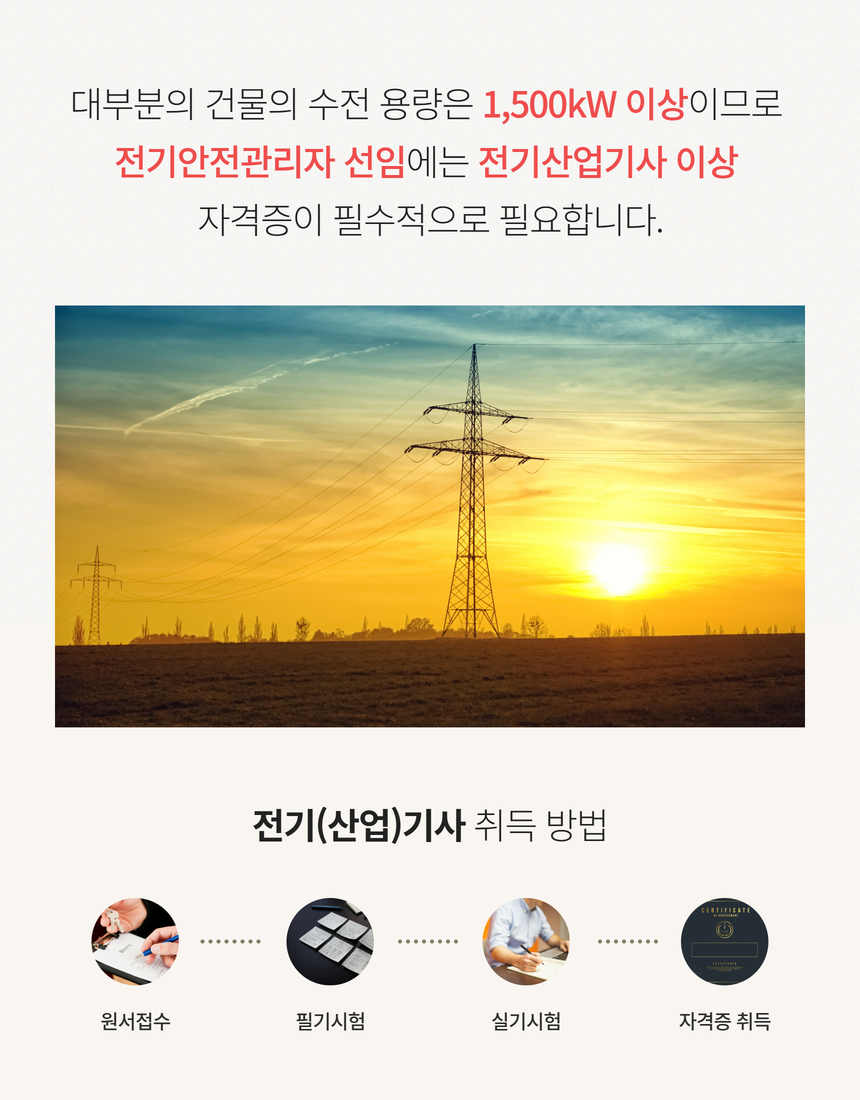 핵심 포인트: 일반적인 상업용 빌딩, 아파트, 공장의 수전 용량은 대부분 1,500kW를 넘습니다. 따라서 가장 보편적으로 요구되는 전기안전관리자 선임기준은 '전기산업기사' 자격증 이상을 취득하는 것입니다. 경력이 없다면, 자격증만으로도 1,500kW 미만 시설의 관리자로 선임될 수 있는 최소 요건이 충족됩니다.